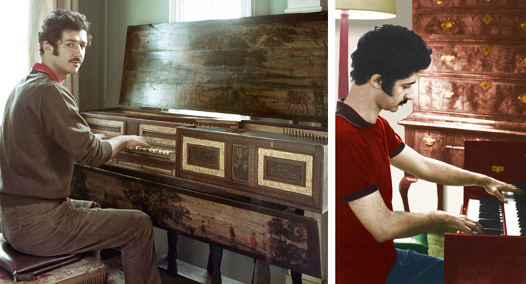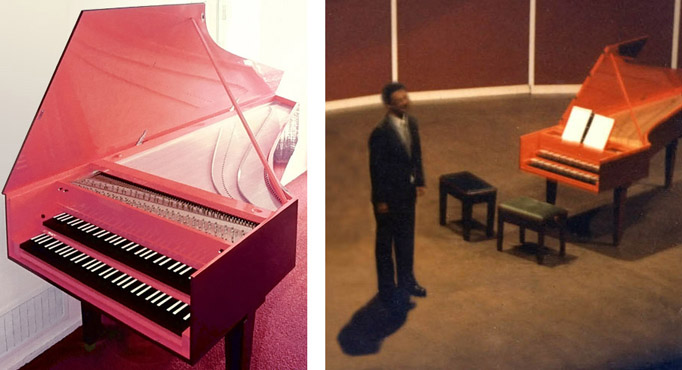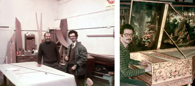 Mi principal interés ha sido siempre la música para clave del alto barroco (1650-1750) y enseguida me dí cuenta de que el “clave doble francés” era el tipo de instrumento que yo deseaba para el resto de mi carrera musical. Como no me podía permitir la adquisición de tal instrumento, en mis visitas a su atélier personal, Bédard amablemente me mostró cómo se fabrica un clave y me instruyó para que yo pudiese fabricar uno de buena calidad a partir de un “basic kit” de Hubbard (Boston). En la foto abajo a la izquierda se me ve con Hubert Bédard en su atélier en Boulogne (Paris) en 1971. En la foto abajo a la derecha estoy tocando el dorado Ruckers-Taskin del Conservatoire de París durante mi visita de 1975.