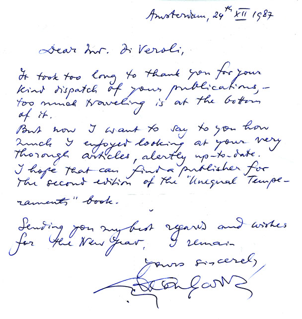 Personal letter by Gustav Leonhardt (December 1987), who had received all my publications up to mid 1987.