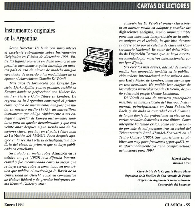 3. Juarez, Miguel (January 1994). "Instrumentos originales en la Argentina". CLASICA. Buenos Aires, Argentina.