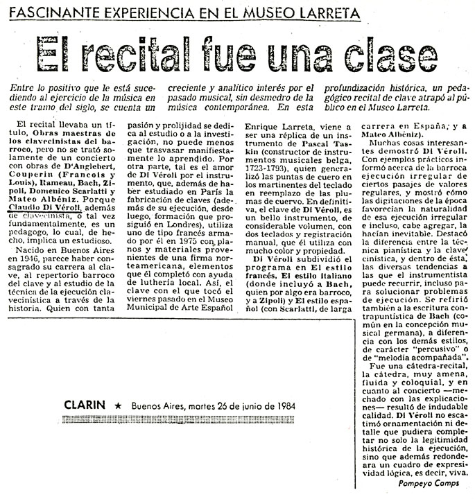 6. Camps, Pompeyo (March 27, 1985). "Los Solistas Bach tocaron su homenaje". Clarín. Buenos Aires, Argentina.