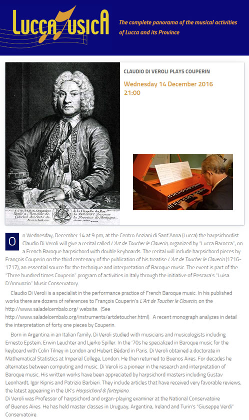 8. "Claudio Di Veroli Plays Couperin in Lucca, Italy". Lucca Musica. December 4, 2016. Retrieved April 2, 2018.